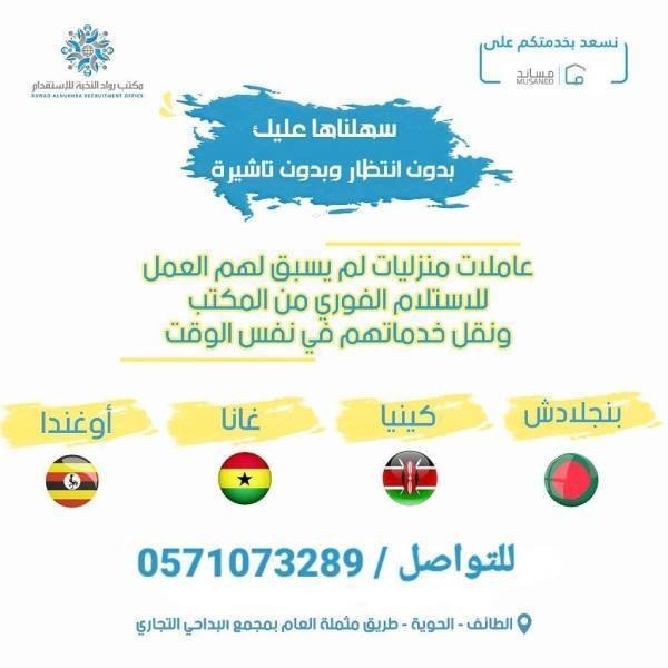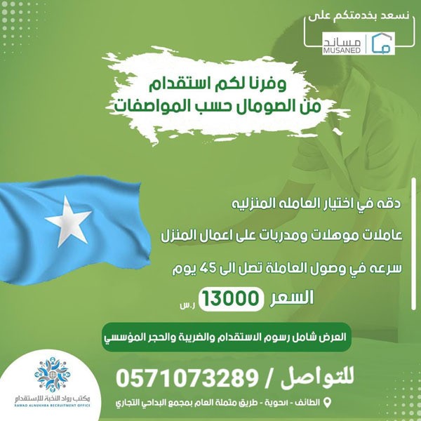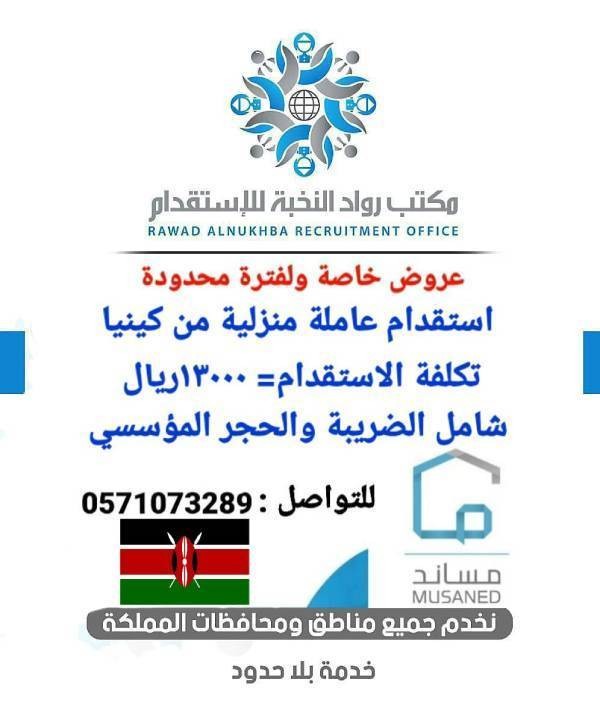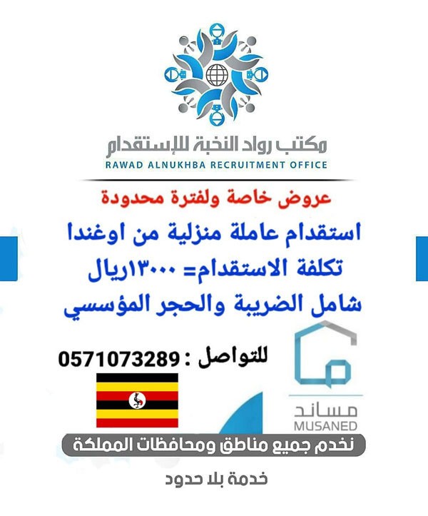 استقدام عاملة منزلية من الصومال خلال ٤٥ يوم تكاليف الاستقدام ١٣٠٠٠ ريال شامل الضريبة والحجر المؤسسي استقدام من اوغندا وكينيا خلال شهرين بتكلفة ١٣٠٠٠ ريال شامل الضريبة والحجر المؤسسي استقدام من بنجلاديش خلال شهرين بتكلفة ١٣٠٠٠ريال شامل الضريبة للتواصل/0571073289 https://i.suar.me/P2aV8/l https://i.suar.me/p7B04/l https://i.suar.me/WOdqw/l https://i.suar.me/Xdje5/l |